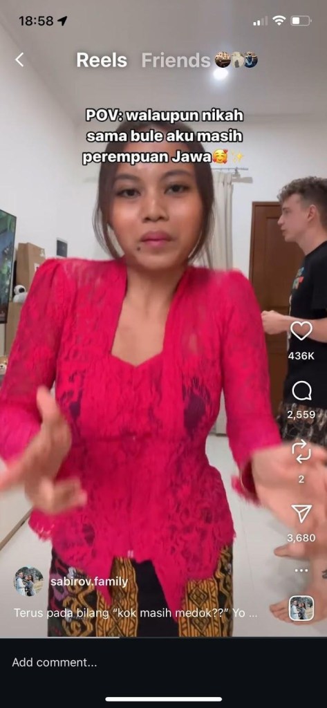 In this video, a wife (whose name is not explicitly mentioned) performs a dance with her husband appearing in the background, accompanied by the caption: ‘POV (Point of View): although marrying a white person (bule), I am still a Javanese woman’ (sabirov.family, 2024, my translation). The phrasing of ‘although’ can be read to imply a perceived elevation in status associated with marrying a white partner, highlighting the interplay between racialized desirability and social hierarchy. As sociolinguistics posit, language is not only a tool for communication but also reflects and shapes identity, status, and social roles (Mujib, 2009; Ibrahim, 2025). From a feminist intersectional perspective, identity, status, and social roles are intertwined and mutually constitutive, shaped and reinforced through language (Crenshaw, 1989). Thus, this Instagram reel illustrates how race, gender roles, identity, and marital dynamics intersect to influence social mobility, drawing widespread public attention with 436K likes. The high engagement suggests that Indonesian society continues to perceive whiteness in mixed-race marriages as particularly desirable and socially intriguing, reflecting broader cultural attitudes toward racialized desirability.
