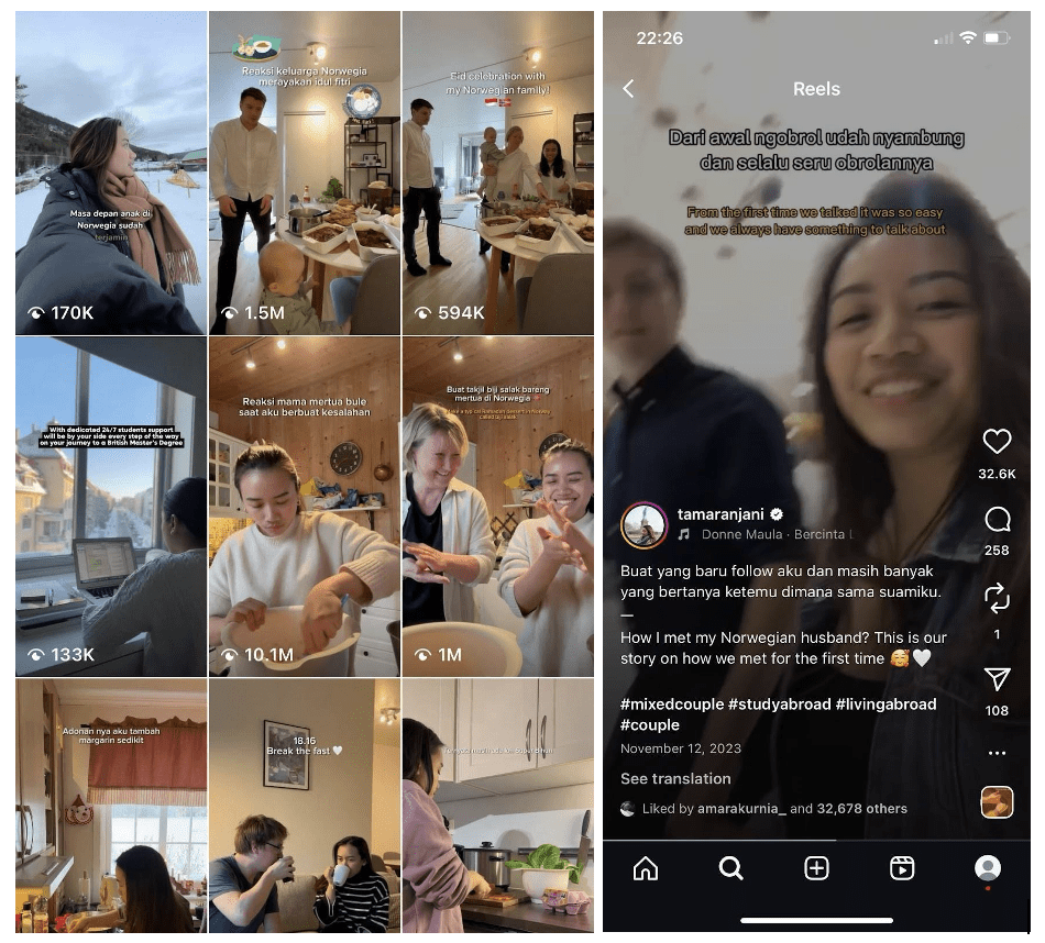 The Instagram handle @tamaranjani also attracts public interest in mixed-race families. This account is owned by an Indonesian woman named Tamara Anjani, who currently resides in Norway with her Norwegian husband. Her content gained significant attention on Instagram when she was studying in Singapore, meeting her husband during that time. Tamara has amassed a substantial following, reaching 307K followers on Instagram (Anjani, 2025). Similarly to @sabirov.family, this account serves as an explicit representation of heteronormative family structures while simultaneously perpetuating racialized ideologies, framing marriage to white partners and international migration as socially desirable trajectories. However, there is a notable distinction between the accounts @sabirov.family and @tamaranjani. While the Sabirov family portrays the husband relocating to Indonesia, Tamara Anjani documents her own move to Europe—specifically Norway—to live with her husband (Anjani, 2025).