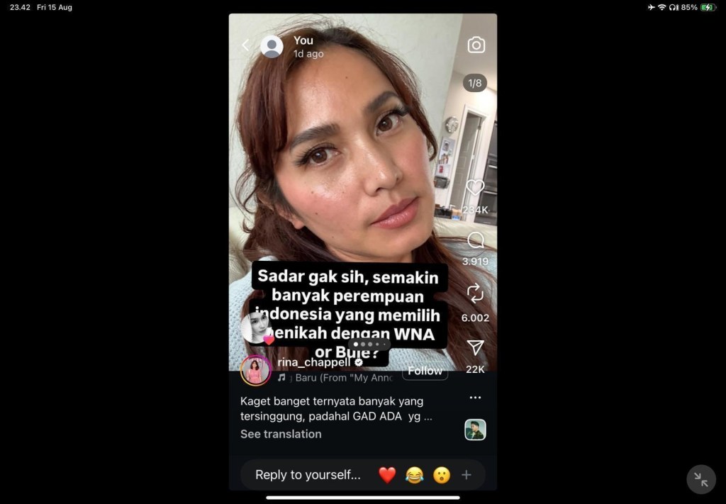 The discourse on partner desirability in Indonesia has been explored through multiple analytical lenses, particularly in relation to gender and race. As demonstrated in the preceding discussion, individuals’ preferences are not merely personal choices but are shaped by broader socio-cultural, historical, and normative frameworks. Within this context, racialized narratives intersect with gendered expectations, influencing how certain groups are perceived as desirable partners. In Indonesia, the term ‘white’, commonly referred to as bule, is not solely understood as a racial category but also signifies a social hierarchy. According to Fechter (2003), the term bule is deliberately used to address white foreigners, primarily based on their skin pigmentation. Consequently, on social media platforms—particularly Instagram—the term bule is widely used to refer to white foreigners. As illustrated by @rina_chappell in a 2025 Instagram post (Figure 1), this usage reflects the consciousness of Indonesian women who choose white partners (Chappell, 2025):
